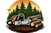 Logotyp för Kungsbacka Trädfällning med tallar, en solnedgång, en motorsåg och stockar, med text som anger att den grundades 2010.